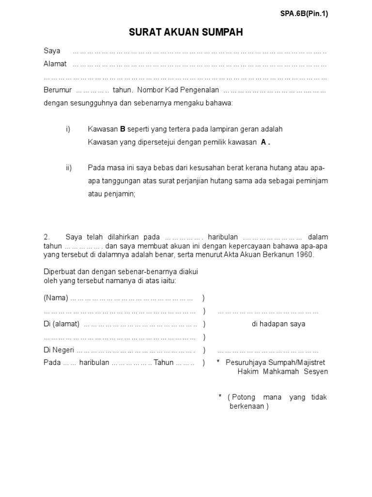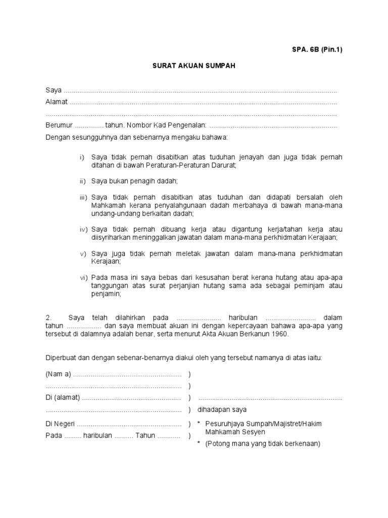 Dan saya membuat Surat Akuan Sumpah ini dengan kepercayaan bahawa apa-apa yang tersebut di dalamnya adalah benar serta menurut Akta Akuan Berkanun 1960. Leave A Comment Cancel reply. Diperbuat dan dengan sebenar-benarnya diakui oleh yang tersebut namanya di.